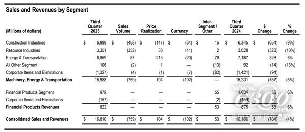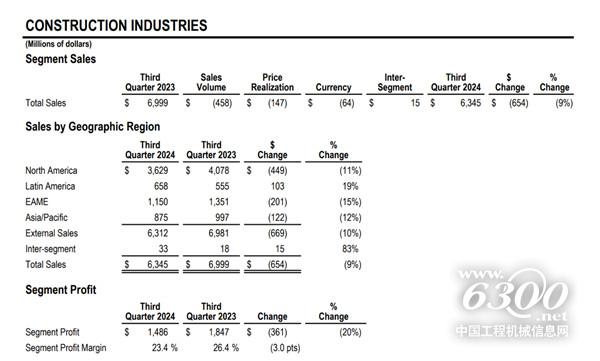 2024年第三季度,卡特彼勒工程机械业务营收为63.45亿美元,比2023年同期的69.99亿美元减少6.54亿美元,同比下降9%。工程机械业务利润为14.86亿美元,比2023年同期的18.47亿美元相比减少3.61亿美元,下降20%。工程机械业绩下降的主要原因是销量减少。