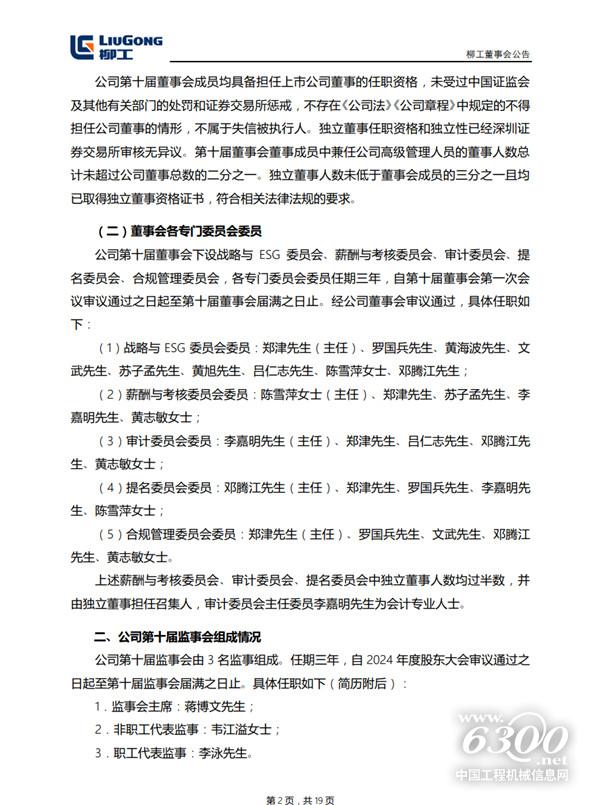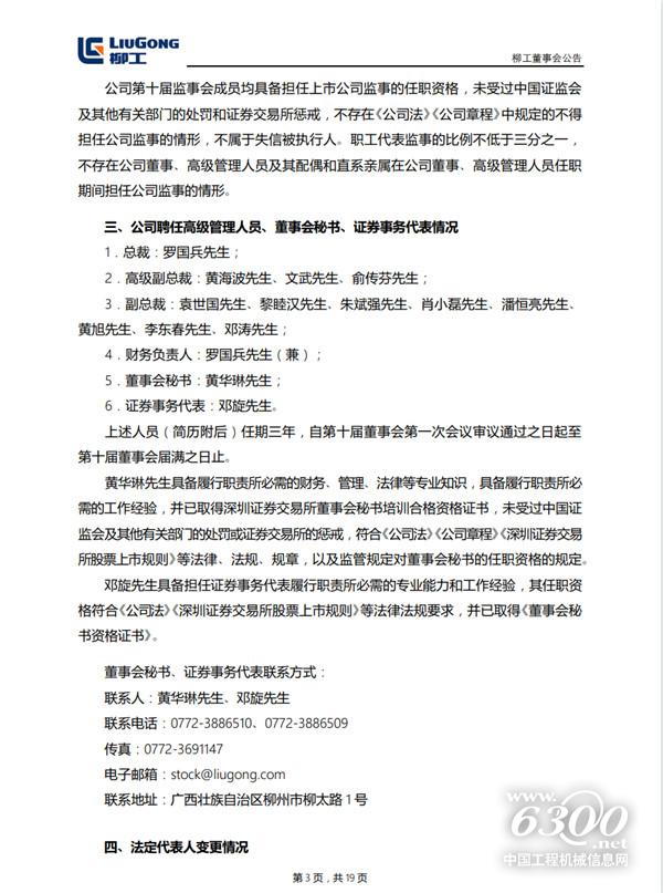 柳工公告丨郑津先生任董事长, 罗国兵先生任总裁
