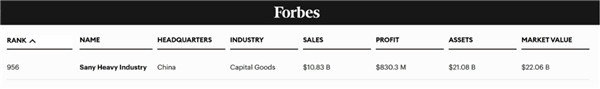 ​​福布斯全球企业2000强丨三一重工稳居中国工程机械第一​​