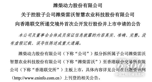 6月21日,潍柴动力公告,拟分拆所属子公司潍柴雷沃智慧农业科技股份有限公司(简称“潍柴雷沃”)至港交所主板上市。这是潍柴动力第二次推动雷沃敲响资本市场大门。