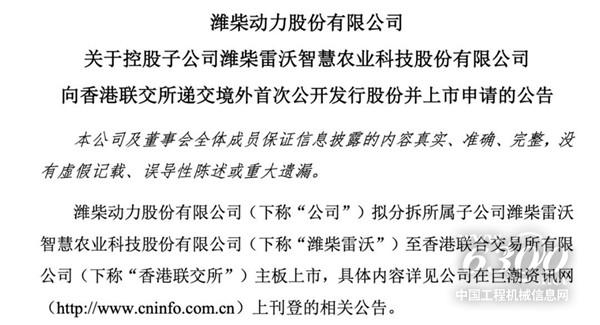 6月21日,潍柴动力公告,拟分拆所属子公司潍柴雷沃智慧农业科技股份有限公司(简称“潍柴雷沃”)至港交所主板上市。这是潍柴动力第二次推动雷沃敲响资本市场大门。