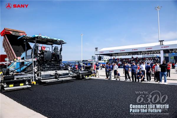 工作人员设定参数后,一台无人驾驶摊铺机精准铺设出长约100米的黑色沥青路面,紧随其后的两台双钢轮压路机与两台轮胎压路机默契配合,完成初压和复压工作。全程无人驾驶,高效协同,令全球客户连连惊叹。