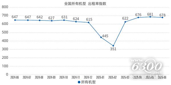 2025年6月升降工作平台出租率指数为678点,环比微降0.4%,同比略涨4.8%。总体看6月份所有机型环比出租率指数有涨有跌,仍然处于分化状态,其中36~39m机型环比涨幅最大为4.2%,40m以上机型环比降幅最大,达到4.6%。2025年6月各机型出租率指数同比涨多跌少,除≤6m和36~39m机型出租率指数同比出现下降外,其他机型均处于增长态势,14~16m机型涨幅最大,达到13.2%,≤6m机型同比降幅最大为5.5%(出租率是以台天数为基准进行计算,100%出租率对应1000点。)