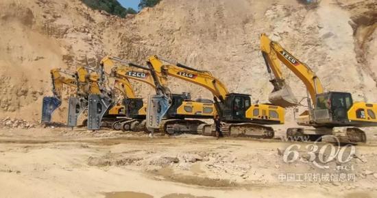 该矿区资源储量丰富,但岩石硬度较高,配备破碎锤的太重超大型液压挖掘机TZ1000,以高效率和高稳定性被用户坚定地选择,在矿区施工作业中冲锋陷阵: