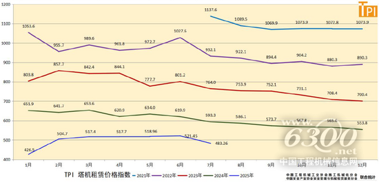 据中国工程机械工业协会施工机械化分会等统计的塔机租赁行业景气指数(TPI),2025年7月份塔机台天利用率57.2%,最大起重力矩利用率56.9%,分别较上月高0.3个百分点和低0.3个百分点;7月份租赁价格指数为483.26点,较上月低38.19点,低于去年同期110.04点。