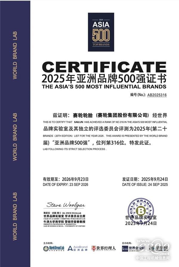 9月24日,全球权威品牌评估机构世界品牌实验室(World Brand Lab)在2025年亚洲品牌大会上发布《亚洲品牌500强》榜单。赛轮集团以1128.96亿元品牌价值再度上榜,位列第316位,品牌价值较去年提升123亿元。这是赛轮连续第七年蝉联该榜单,品牌价值与排名实现持续“双增长”。
