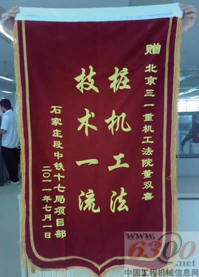 2011年7月1日,客户和京石铁路石家庄段中铁十七局项目部负责人来到了北京三一,为公法研究院工程师董双喜送来了一面锦旗。“三一的施工效率已经大大超过了国外的标杆产品,三一不愧为民族品牌的骄傲!”客户李先生自豪的对记者说。