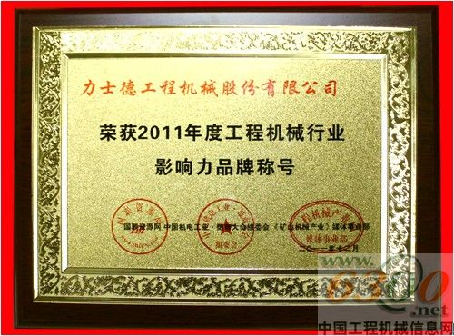 力士德公司荣获“2011年度工程机械行业影响力品牌”称号