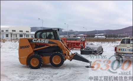 凯斯滑移装载机配备斜角清雪器进行清雪作业