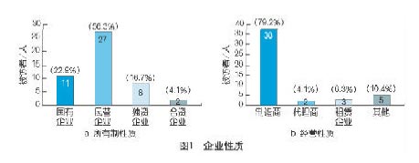 在参与调查的48人中,有11人供职于国有企业,占总调查人数的22.9%;27人供职于民营企业,占总调查人数的56.3%;8人供职于独资企业,占总数的16.7%;另外还有2人供职于合资企业。其中,有38人所属的企业是制造商,占79.2%;3家是租赁企业,占6.3%;其他有5人,占10.4%;只有2人选择了代理商。可见,由于桩工机械行业属于大型施工设备范畴,企业大部分选择了厂家直销的经营模式,而很少发展区域代理。另外,民营企业所占的比例远远高于国有企业,这也说明在行业内民营经济已经扮演着越来越重要的角色(见图1)。