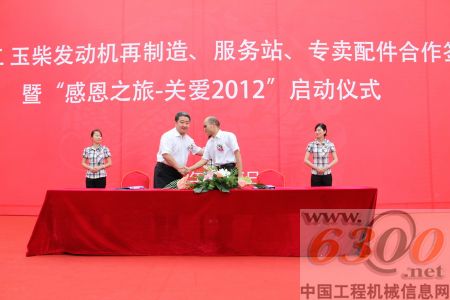为了高效提升玉柴重工服务品牌形象,提高玉柴重工市场竞争力,2012年5月25日,玉柴重工玉柴发动机再制造合作项目、玉柴发动机服务站、广西玉柴机器专卖发展有限公司配件合作签约—暨“感恩之旅-关爱2012”启动仪式在中国常州隆重举行,玉柴机器股份有限公司、玉柴再制造工业(苏州)有限公司、玉柴重工配套供方代表、玉柴重工主要领导和员工代表、玉柴重工经销商代表以及全国媒体单位代表等约计600余人参加了仪式;同日,玉柴重工全国数十家经销商全国联动,共同拉开2012年全国服务用户、关爱用户大行动。