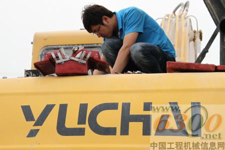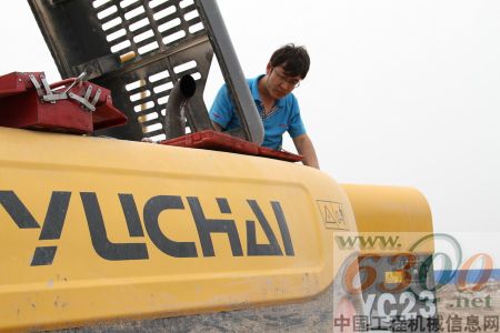 为了不打扰施老板YC230-8挖掘机正常的忙碌作业,吴工一行决定对施老板的YC230-8挖机做认真、迅速检点。虽然施老板对自己的挖掘机作业情况感觉一切正常,鉴于夏天已至,吴工一行唯恐挖掘机发动机、油冷器、水冷器等温度异常,连忙帮助施老板的YC230-8挖机做细心检查;经十余分钟检点,吴工发现施老板的YC230-8机器的油冷器、水冷器、空调等由于工作时间长、工作条件较为恶劣、清洁不足等情况易引起油渍、污渍、灰尘等堵塞,容易引发散热不良,不到一个小时的时间,服务工程师几人便为机器做完清洁与维护工作。“我平时也挺注意清洁这一块,现在油温、水温都不高,也没太在意清理油冷器和水冷器这一块,你们玉柴重工的服务做的越来越及时,我们很满意,感谢你们这么大老远的来服务”,在一旁“督战”爱机做检点的施老板乐得合不拢嘴的说。