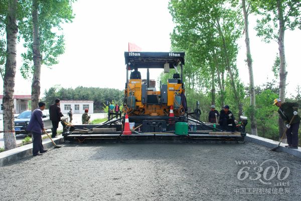 蓝天白云,绿树掩映,一条黑色柏油马路横贯其中,马路上一台标着ABG8620的鲜艳黄色大型设备占据了整个路面,显得格外醒目,仿佛是一幅惬意的山水画。几台红色送料车、几许施工人员围绕该设备来回穿梭,悠闲而紧张。