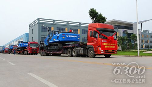 在王跃钦副总经理的号令下,伴随着现场人员的掌声和欢呼声,满载着20台挖掘机的车队身披大红花,浩浩荡荡驶出公司。