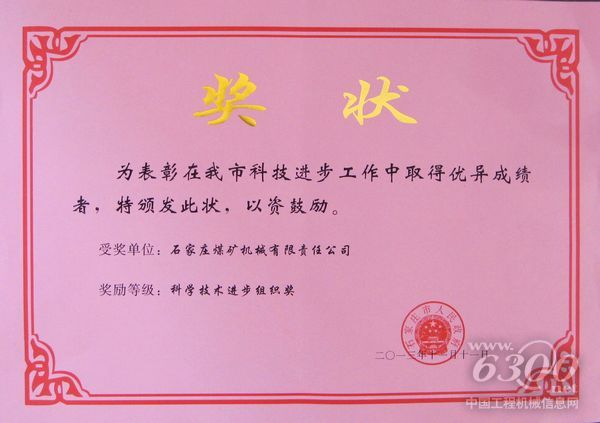 日前,石煤机公司被石家庄市人民政府授予“石家庄市科学技术进步组织奖”,石家庄市获此荣誉的企业共8家,是市政府对2013年度为发展本市科技事业,促进经济社会发展做出突出贡献单位的褒奖。