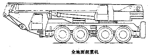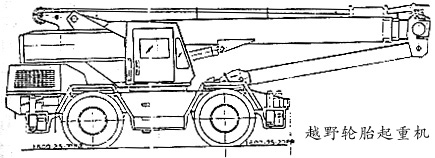 是70年代发展起来的一种起重机,其吊重功能与轮胎起重机相似,也可进行不用支腿吊重及吊重行驶。所不同的是底盘的结构形式及由独特的底盘结构所带来的行驶性能的提高。这种起重机的发动机均装在底盘上,底盘有两根车轴及四个大直径的越野花纹轮胎。四个车轮均为驱动轮及转向轮,当在泥泞不平的工地上转移工位时,四个车轮都传递动力,即四轮驱动,以提高通过泥泞地面及不平路面的能力。当在平坦路面以较快速度行驶时,只用前轴或后轴的两个车轮驱动,以减少能耗。在起重机的随机文件中,用4×4表示四轮驱动,4×2表示4个车轴中有两个车轮是驱动轮。该车型适合狭小的场地作业。可实现连续无极变速,在路面阻力突变的情况下发动机也不会熄火,因而极大的方便了司机的操作。可以所越野轮胎起重机是一种性能扩展了的、强力而灵活的轮胎起重机。