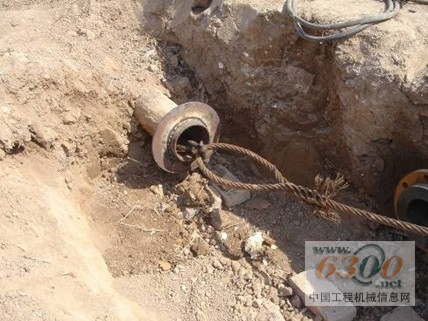 4)使钢丝绳处于无载荷状态,移开机器,拆卸连接件,将机器分成三个部分,依次从钢丝绳远端移出。此时可看到新PE管线一端出现在机器工作坑内,工程圆满结束。