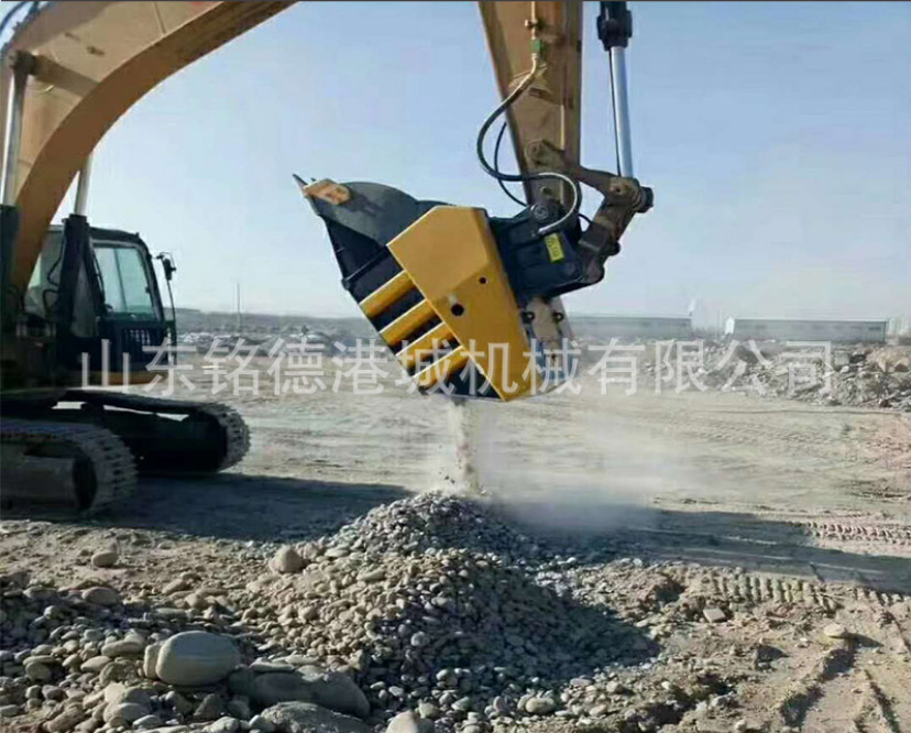 破碎机改装后安装到挖掘机,变成破碎斗可以破碎矿山岩石、花岗岩、青石,也可以破碎河道鹅卵石破碎建筑垃圾、水泥块等坚硬物料。 利用挖掘机液压油缸来驱动破碎,原理和破碎机一样,通过颚板挤压物料,在破碎斗出料口有调节装置,可以根据需要破碎的大小来调节,出料产量一般每小时20吨左右,也要看挖机师傅操作熟练度,破碎物料大小,物料硬度和挖机工作状况等因素。此设备适用于多品牌挖机,根据吨位大小配给的破碎斗型号也不同,工作方便,可以现场破碎物料,像拆迁施工,山路维修等会节省大量时间,同时能节省部分运费,破碎后的混合料可回收可回填,还能节省基建所需的费用,总体来说这款挖掘机破碎斗移动方便,无论到哪都是破碎站。