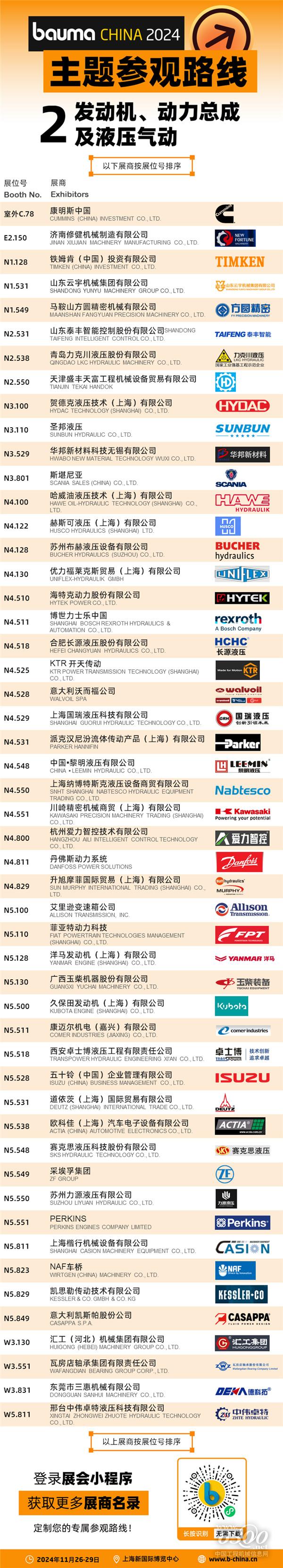 观展不能漫无目的,先从哪里开始看?为便于观众在参观展会中快捷高效地找到意向展商和产品,bauma CHINA 2024主办方从3400+展商和覆盖12大主题355个细分领域的数以万计新产品与新技术之中,围绕关注度最高的参展企业和热门展品领域,精心打造5条主题参观路线。