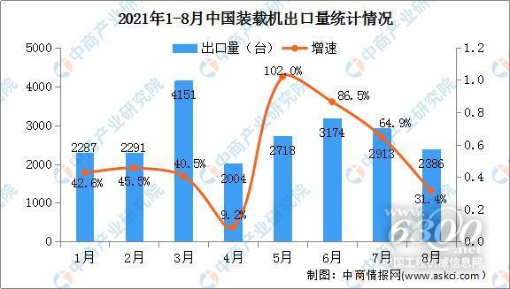 2021年1-8月,共销售各类装载机102800台,同比增长18.1%。其中3吨及以上装载机销售94524台,同比增长15.3%。总销售量国内市场销量79720台,同比增长10.3%;出口销量23080台,同比增长56.3%。