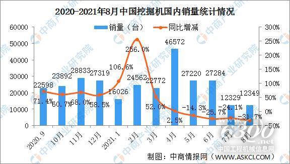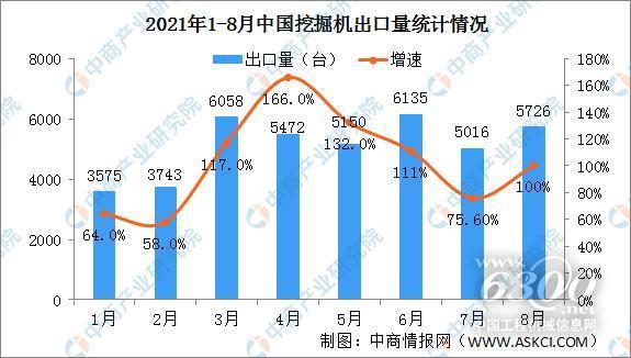 据中国工程机械工业协会对25家挖掘机制造企业统计,2021年8月挖掘机销量为18075台,同比下降13.7%;其中国内12349台,同比下降31.7%;出口5726台,同比增长100%。