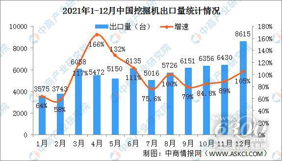 2021年1-12月,共销售挖掘机342784台,同比增长4.63%;其中国内274357台,同比下降6.32%;出口68427台,同比增长97%。