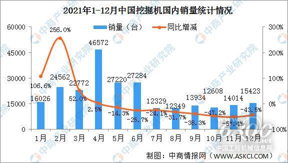据中国工程机械工业协会对25家挖掘机制造企业统计,2021年12月销售各类挖掘机24038台,同比下降23.8%;其中国内15423台,同比下降43.5%;出口8615台,同比增长105%。