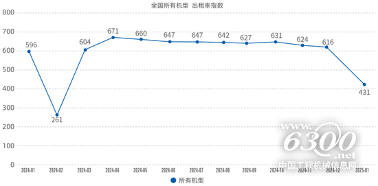 2025年1月升降工作平台出租率指数为431点,环比下降29.9%,同比下降27.7%。由于每年春节假期的影响及其时间的变化,1、2月份的出租率指数一直跳跃较大。总体看1月份所有机型同比、环比出租率指数均处于下降状态,其中24m以下机型环比下降幅度最大,均超过30%,40m以上机型降幅最小为11.4%。2025年1月各机型出租率指数同比情况:12m以下剪叉车同比下滑超过30%,14~28m臂车同比降幅超过20%,而30m以上机型出租率同比降幅最小,均超过10%。(出租率是以台天数为基准进行计算,100%出租率对应1000点。)