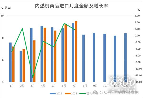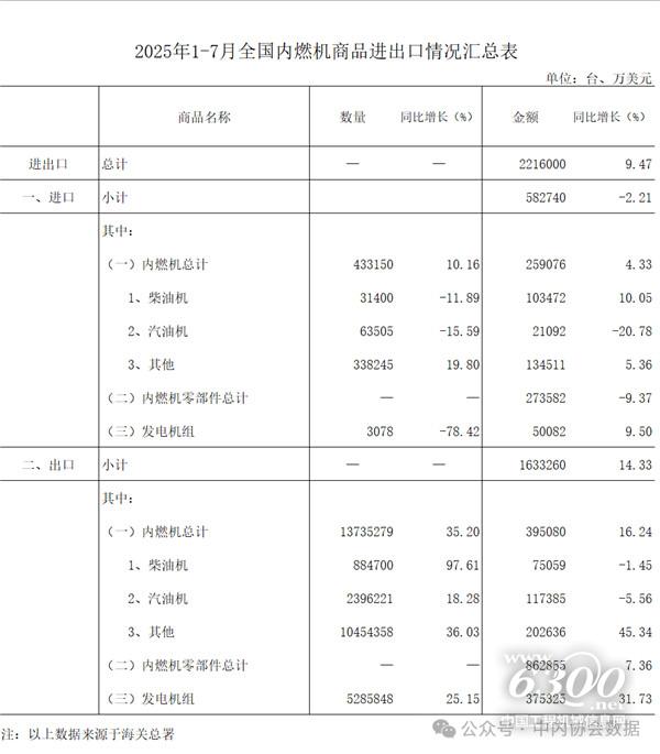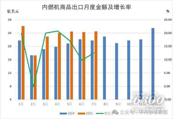 2025年1-7月内燃机出口163.33亿美元,同比增长14.33%